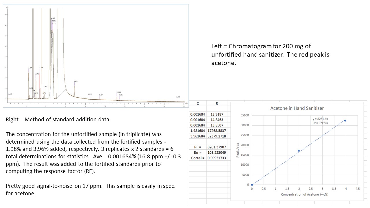 In the end, I determine that my sanitizer contains 16.8 +/- 0.3 ppm (standard deviation of the mean) acetone. This sample is well within spec for acetone. Knowing what I know now, I'd go back and fortify the samples at lower concentrations. But, this wasn't too bad and pretty good sensitivity at lower temperature.